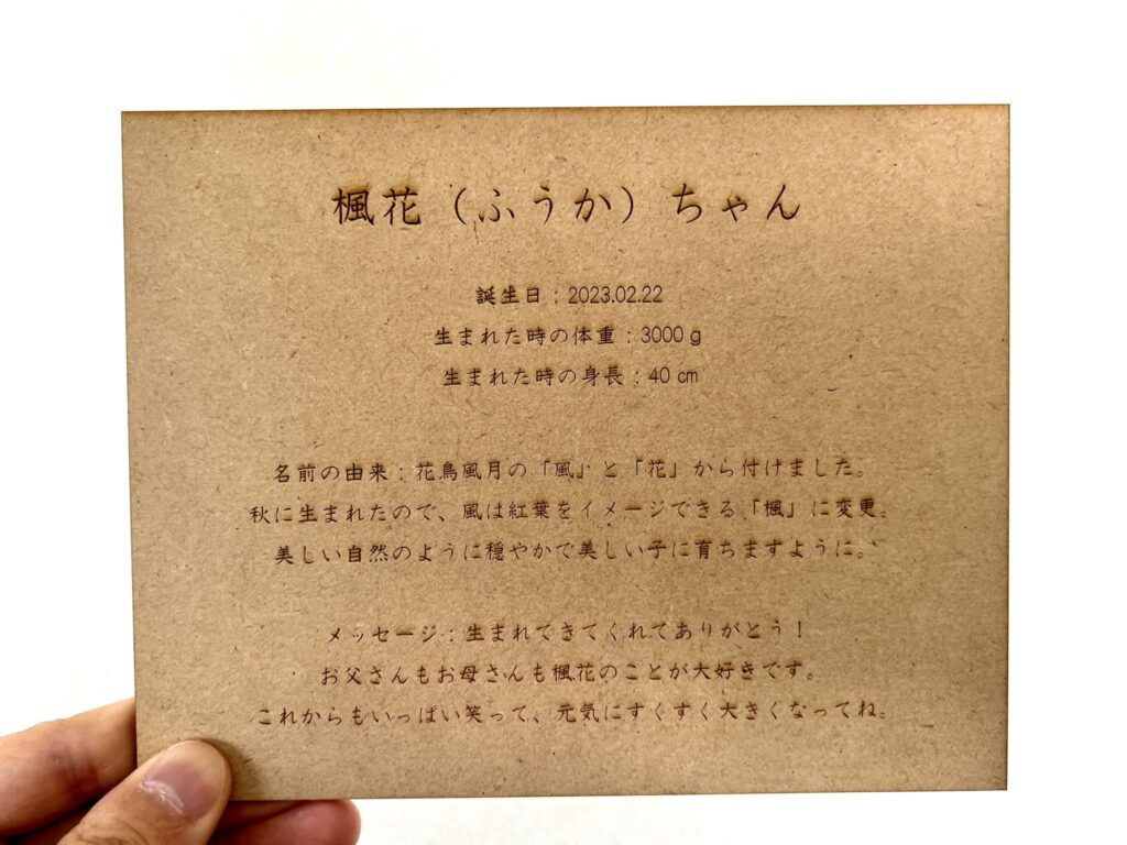 表面に赤ちゃんの名前と誕生日を刻み、背面にはオプションで名前の由来等を刻むことが可能です。