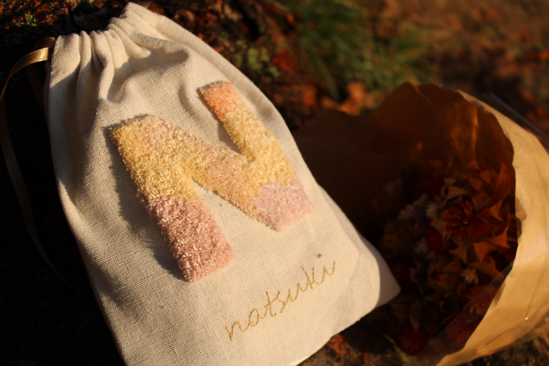 オーダー時にイニシャルとアルファベットでお名前を教えて頂き、お好みの色の刺繍糸でイニシャルを刺繍致します。