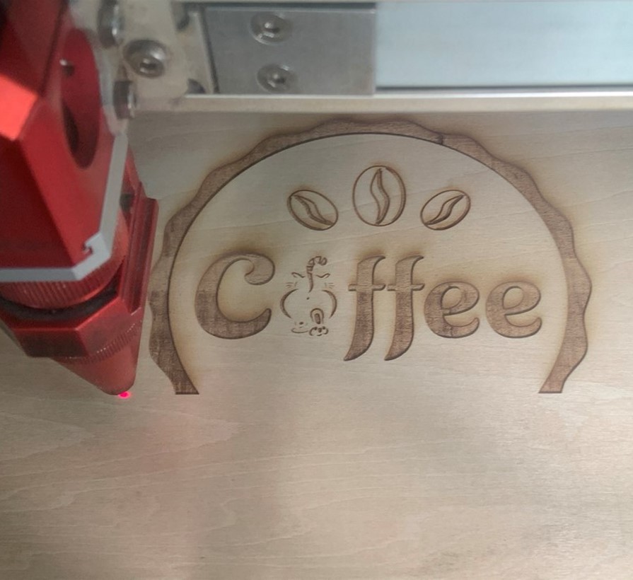 設定が完了したら、いよいよレーザーによる彫刻とカッティングを進めていきます。自分で描いた通りに木材が加工されていく様子はいつもワクワクしますね。彫刻中の写真です。