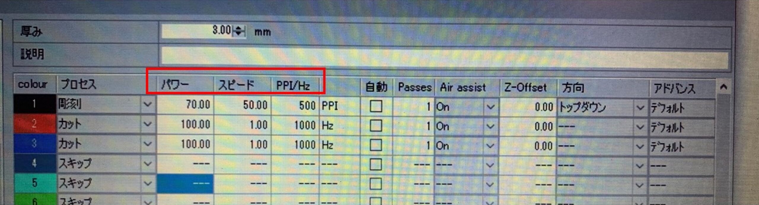 イラストレーターでデータを開き、線種や色の最終確認をして、レーザーカッター用のプリンターにデータを出力します。ここで大事なのが各線色のパワーとスピード設定です。今回はこんな設定でやりました。