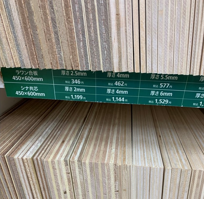 レーザーカッターで使用する木材は反りの少ないMDFを使用することが多かったのですが、今回は木目のあるシナ合板を使いたいと思います。出来る限り反っていない木材を選び、しばらく平置きしておきました。