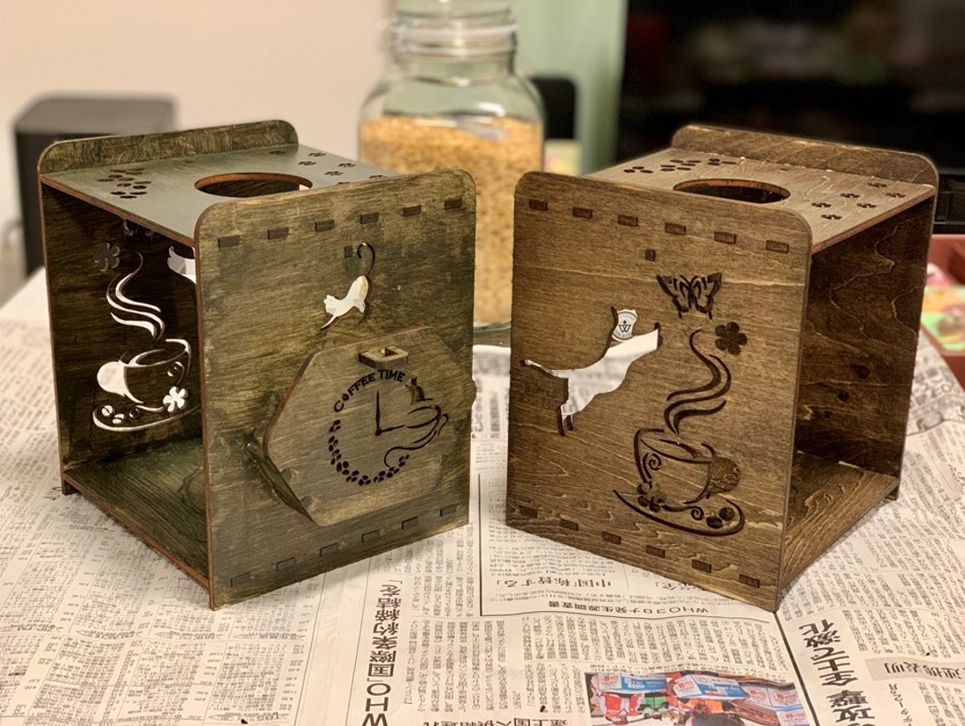 レーザーカッターで切断できた木材はヤスリをかけた後にアンティークカラーのグリーンとブラウンの2色に染めてみました。染めた後に撥水性を高める為に透明のウレタンニスを吹きかけてコーティングしています。