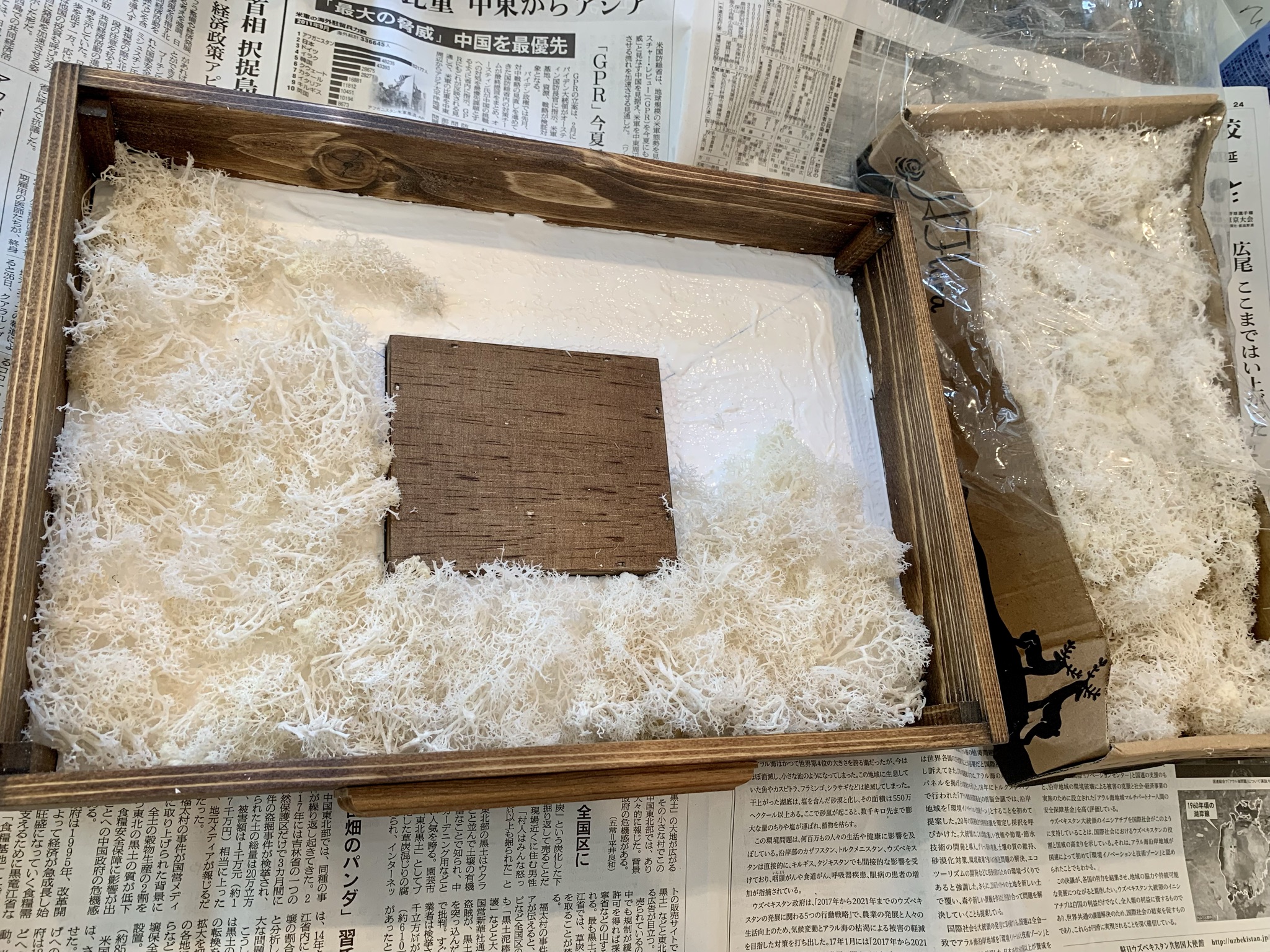 発泡スチロールにボンドを薄く伸ばし、その上にホワイトモスを敷き詰めていきます。