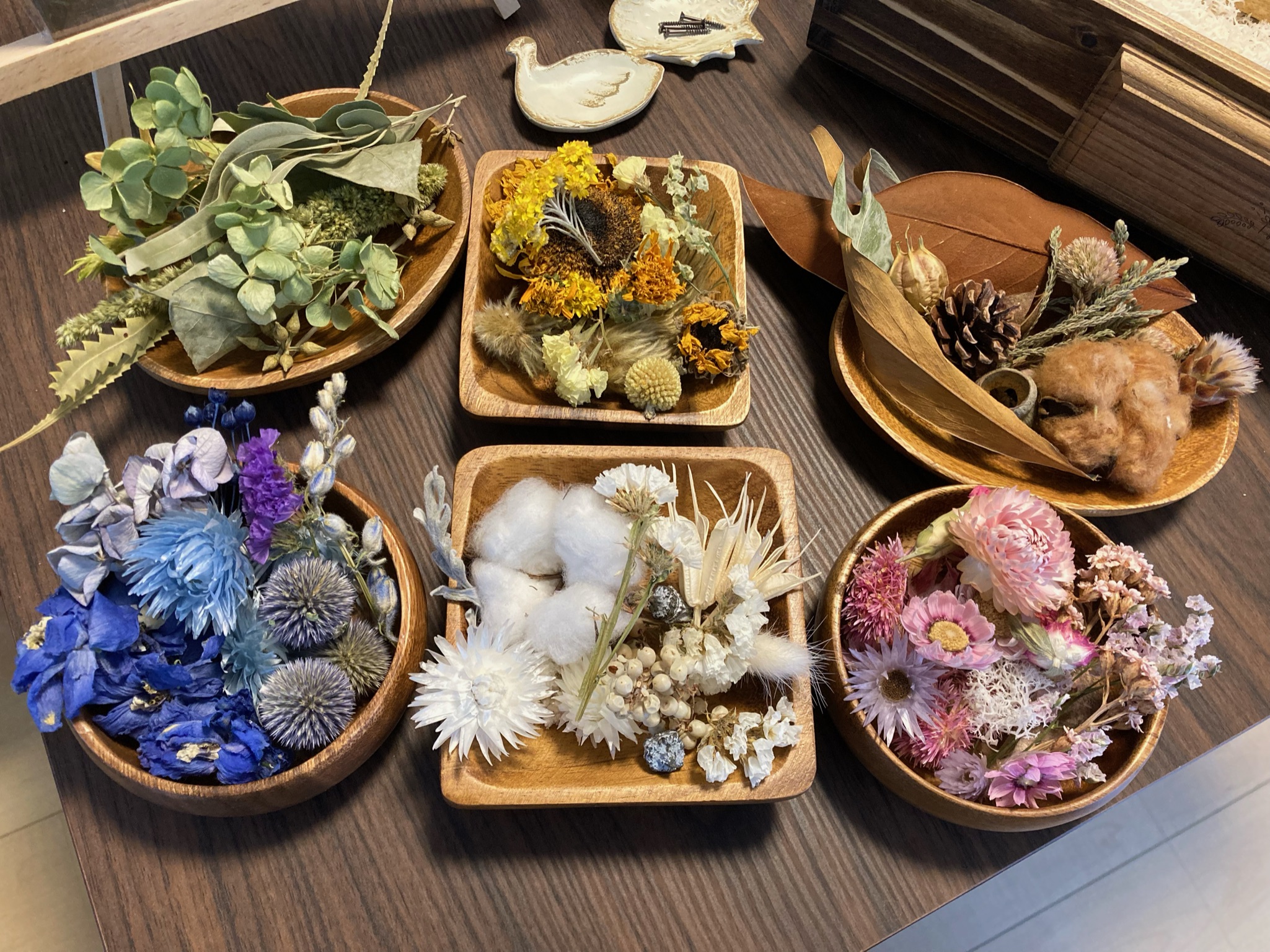 花材はこんなドライフラワーを6色選びました。