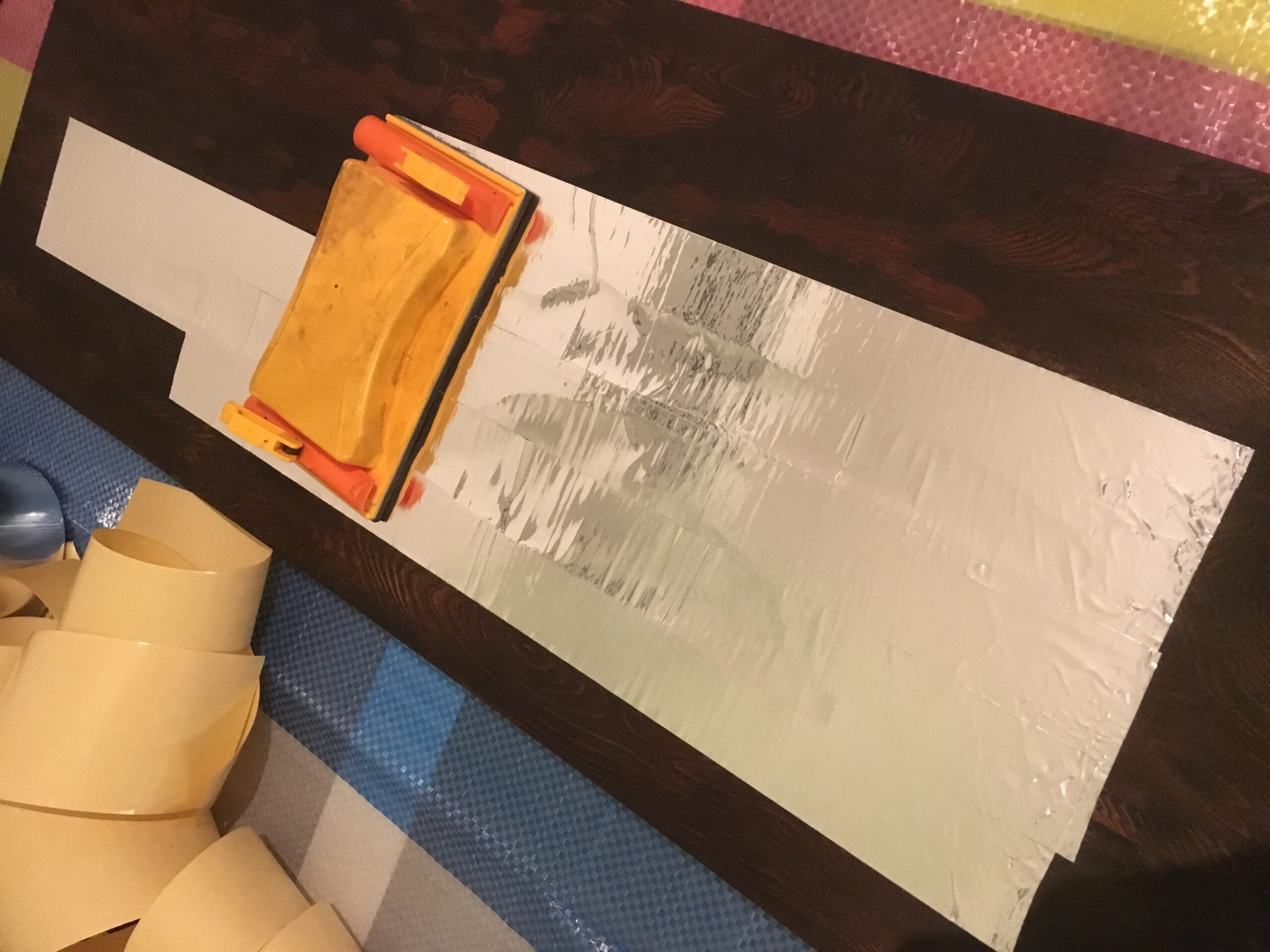 その後に木材にアルミテープを張り、よーく密着するように擦ります。