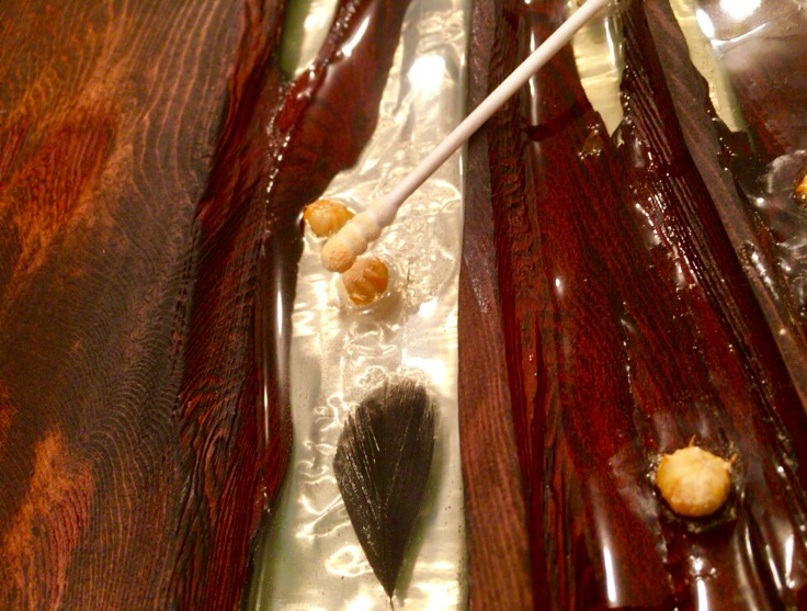 木の実や葉っぱ等をレイアウトします。完全硬化する前に最後まで流し込むのがコツです。